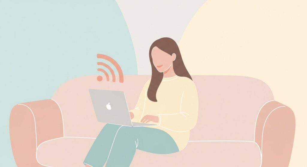 Seorang wanita duduk santai di sofa sambil menggunakan komputer riba untuk menonton video dengan sambungan internet yang lancar.